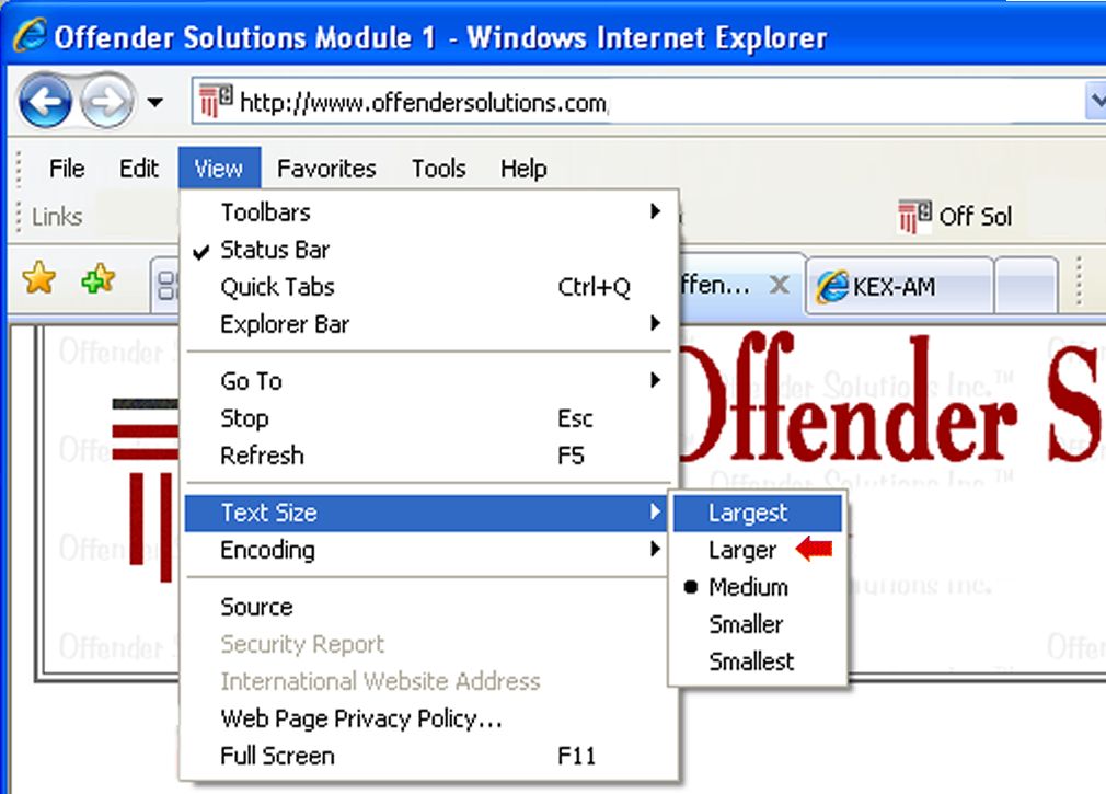 If you would like to read with bigger letters you "probably" can. If you are using Internet Explorer you can go to "View" and then select "Text Size" and then chose "Largest" or "Larger" or "Medium." See picture below: (To go back to your previous page use your browsers back button (arrow).